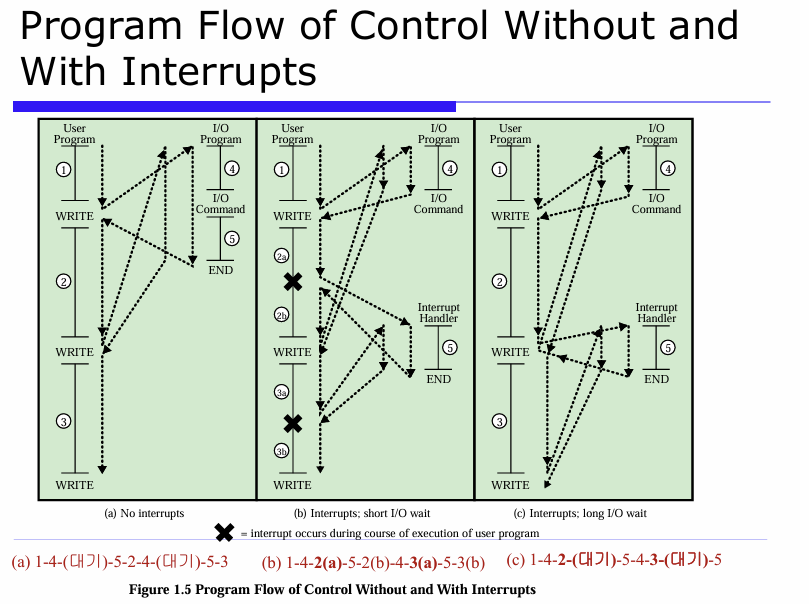 (b) With Interrupts – 인터럽트 + 짧은 I/O 대기 시간 - CPU는 기다리지 않고 다음 사용자 명령을 계속 실행. 병행성↑