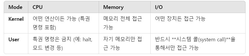 mode bit : 0이면 커널 모드, 1이면 사용자 모드, kernel모드에 의해서만 바뀐다.