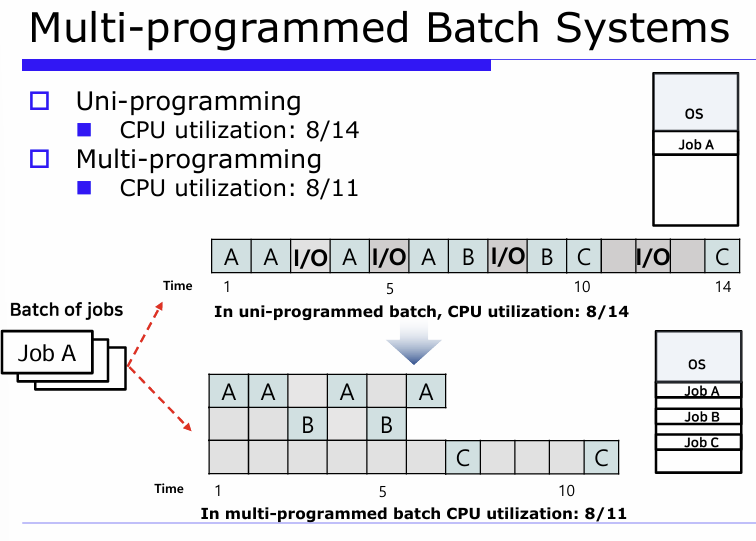 Multi-programming (다중 프로그래밍) : CPU낭비 없이 하나의 작업에 I/O명령이 들어올 경우 바로 다른 프로그램을 실행한다.