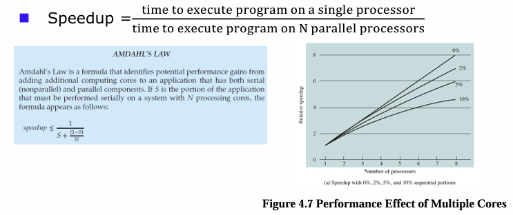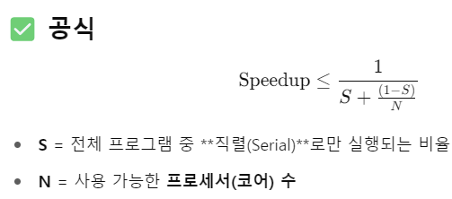 병렬 처리의 한계를 설명하는 법칙으로, 전체 프로그램 중 병렬화 불가능한 부분(S)이 존재할 경우,